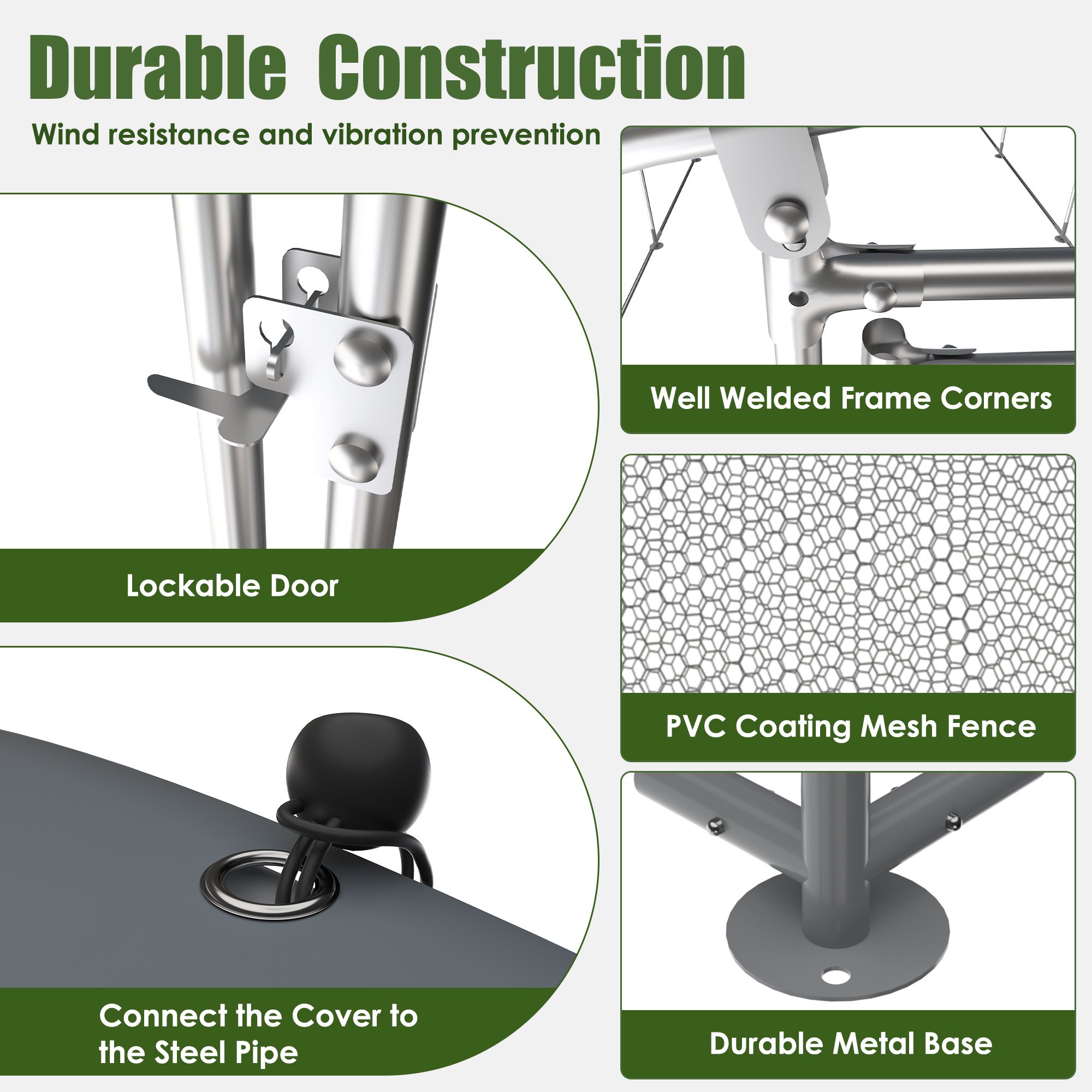 [Durable Steel Structure]Our heavy-duty metal coop is made of the high-quality steel frame. A large metal coop for long-term use is the point we keep in mind all the time when we produce this product, so we added additional support columns and triangular supports. The stainless steel coupled with galvanizing technology resistance of the cage.